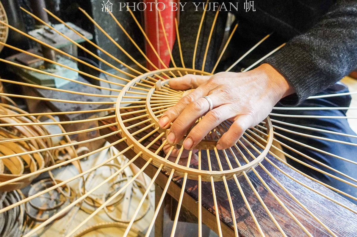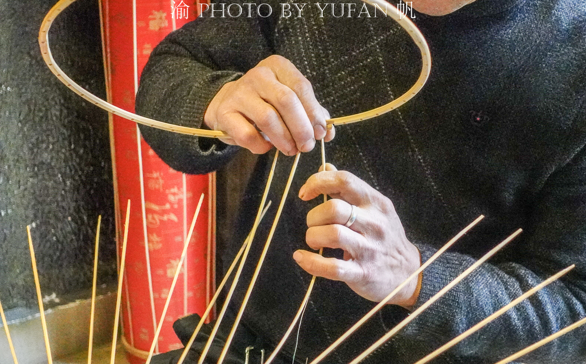 材料准备好了之后,就是制作了,最开始是进行笼箍的制作,相对而言,这道工序比较费力,无论是底圈还是顶圈,都要将竹条沿着钢圈模内侧盘卷,是竹圈层间尽量不留空隙,这项工作对力气的要求比较大,一般都是家里的男人来完成,而女人通常负责拉丝打孔等配套工作。
