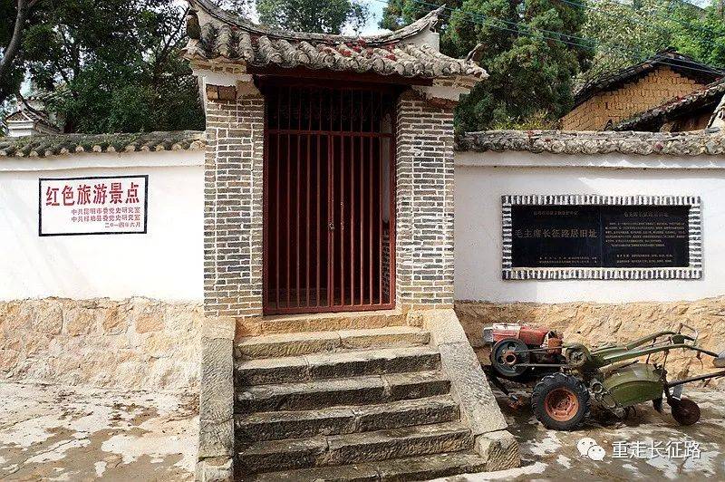 这是汪姓人家的民居,小院的白墙上挂牌“毛主席长征路居旧址”,其上简介:1935年4月29日,红一方面军军委纵队和红五军团在毛泽东、周恩来、朱德等中央领导同志的率领下,从寻甸柯渡出发,沿寻甸鸡街、九龙三哨、跨过铁索桥、抢渡金沙江。5月1日,部队到达翠华镇界牌村宿营。毛主席在一汪姓老乡家住宿办公。第二天凌晨,在嘹亮的军号声中,红军队伍又浩浩荡荡的向团街、皎平渡进发。