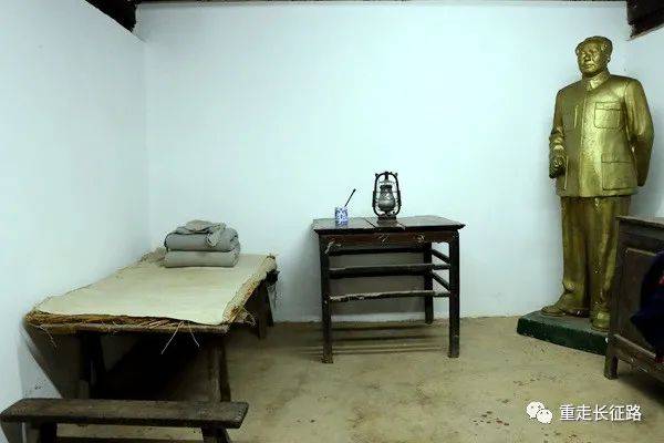 室内陈设着当年毛泽东睡觉的简易木床、用过的一张方桌、一个条凳及马灯等物,还立着一尊毛泽东塑像。