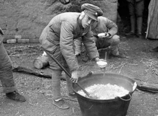 多数士兵的粮食只能就地取材。基本上是几个士兵围着一口锅,里面则是盐水煮菜。这么差的伙食
