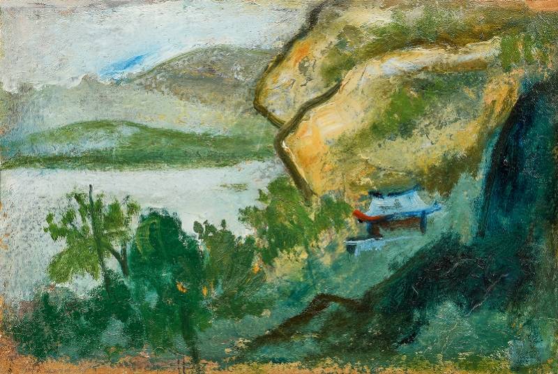 关良的《山区风景》尺幅虽小,但画家通过空间结构、色彩的运用,赋予画面一种独特的韵律,颇有卧游溪山之情趣。