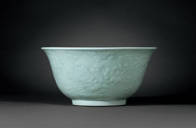 清雍正粉青釉凸花四季花卉三多纹大碗,通体施粉青釉,外壁釉下凸饰荷花、牡丹、茶花、佛手、寿桃、石榴等折枝花果,纹饰立体,线条流畅,气势非凡。