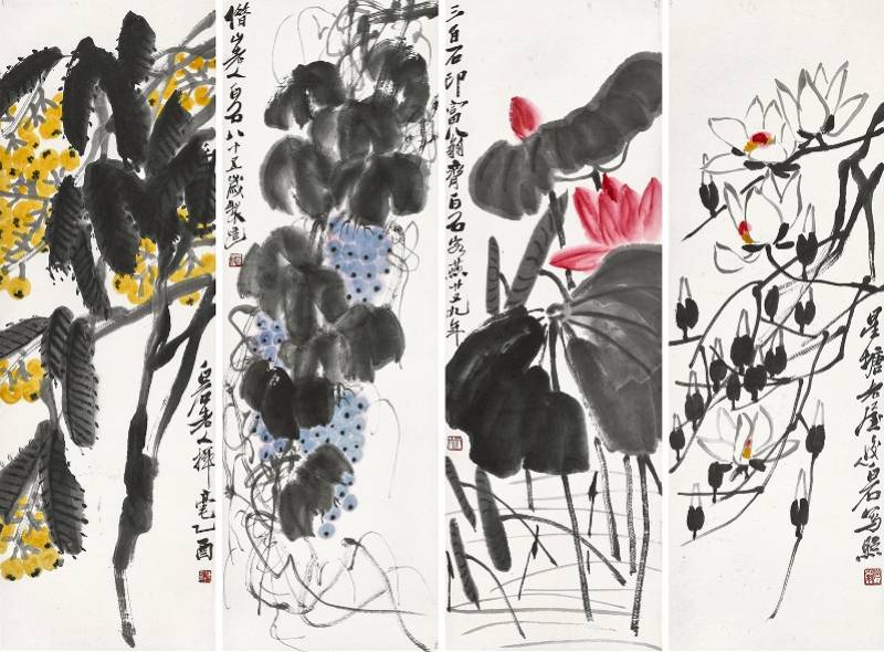 齐白石亦有多幅佳构,跨越不同艺术时期。《香卉佳果四屏》为1945年白石老人八十五岁时作品,分写白玉兰、紫葡萄、红荷花与黄枇杷,笔墨纵肆,色泽明润。
