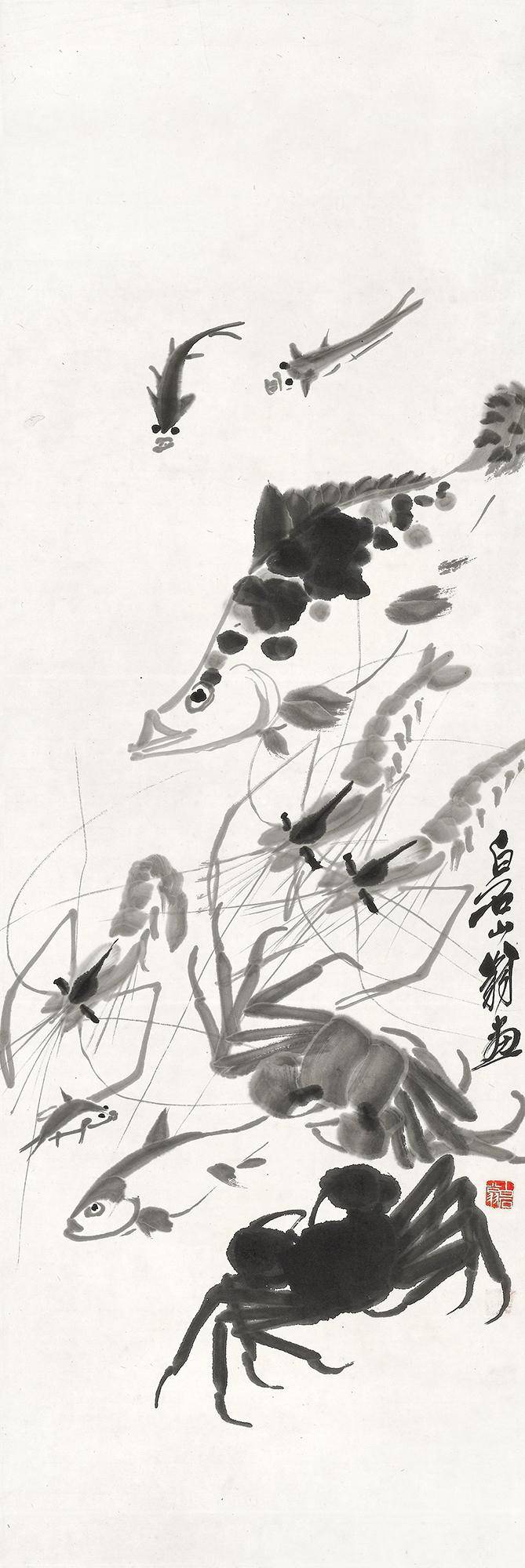 齐白石 水族群乐 镜心 水墨纸本 103.5x34.7cm. 约3.2平尺