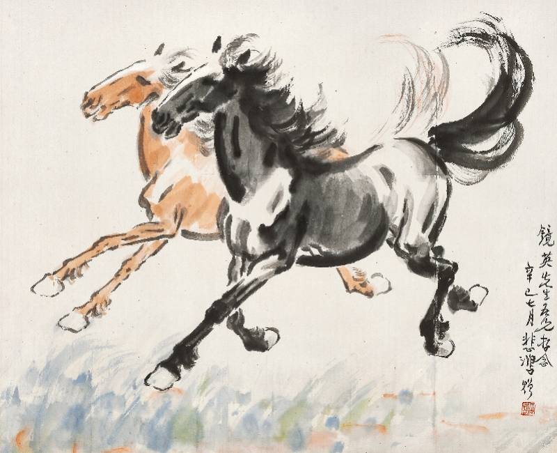 《齐头并进》为1941年7月徐悲鸿旅居新马期间所作,黑色、棕色两匹骏马并肩奔驰于坡地,寓意和美,精神非凡。
