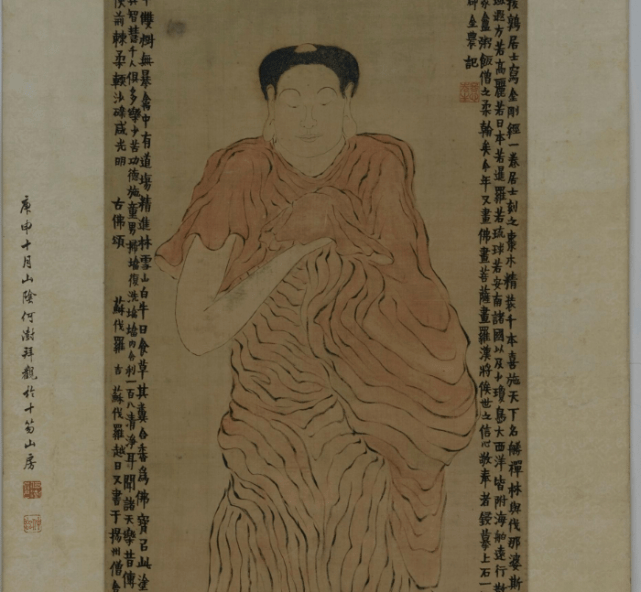 原来,这里一共有70幅字画,其中被称为“国宝级”字画的是《古佛图》,纵250.8厘米,横70厘米,画中线条流畅,颇有升腾动荡的奇妙意境。那么,这幅画有什么来历?《古佛图》出自扬州八怪之首金农,清代有名画家。