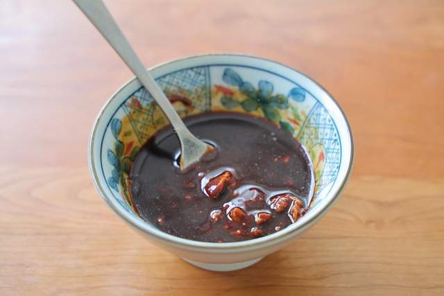 6、再来调个酱汁:1块腐乳放入碗中,先压碎,然后加入番茄酱、生抽、老抽、盐、蚝油、料酒,搅拌均匀;