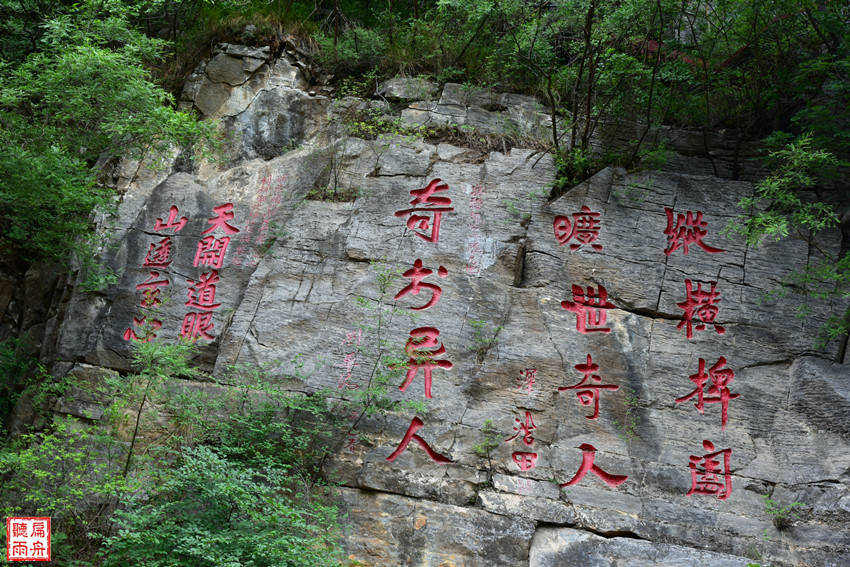 从高台上的八卦城大大门向南透视出去,正对的是高高耸立在悬崖绝壁上的南天门,很壮观,很漂亮。