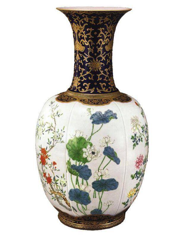 图丨粉彩霁蓝釉描金花卉纹六瓣瓜棱大瓶