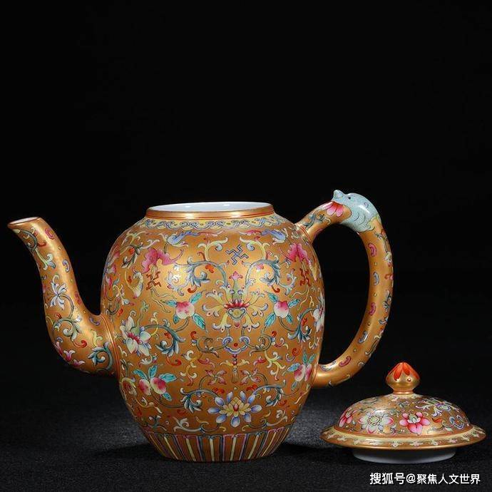 描金彩宝珠钮,长曲流,耳型把。这么独一无二的一把壶,估价高达1.5个亿,并不过分。