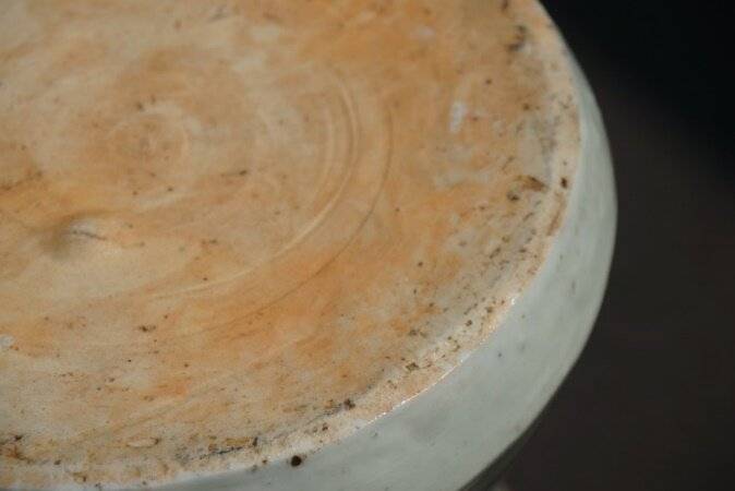 糙底无釉,圈足极浅,有旋削痕和火石红。
