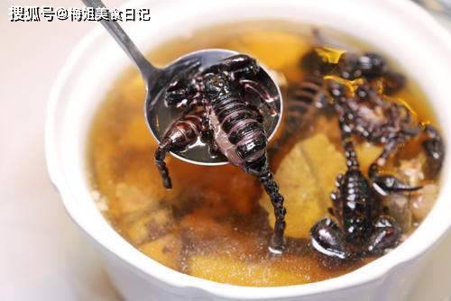 广东人讲究吃啥补啥,用蝎子煲汤,以达到以毒攻毒的目的。虽然蝎子看起来可怕,但它是我国传统名贵中药,有通经活络、祛除湿气的功效。