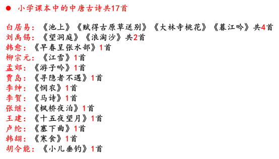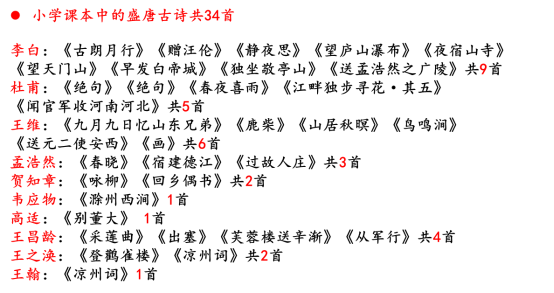 2、小学课本上出现的唐诗一共有59首,其中盛唐最多,李白贡献最大,其次是王维和杜甫。