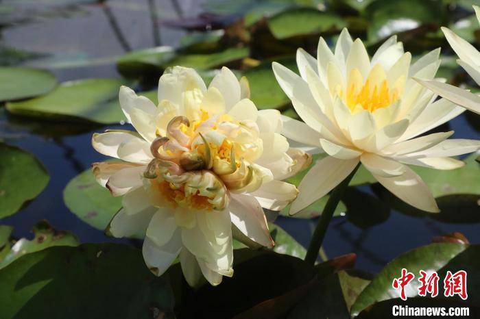 中新网广州8月31日电 (程景伟 陈晓川)记者31日从广州番禺莲花山景区获悉,莲花山近日发现一株睡莲开出“七芯花”奇观:睡莲中心长出七个花芯,其中一个花芯居于正中,另六个花芯两两相连,可谓“手牵手,心连心”。