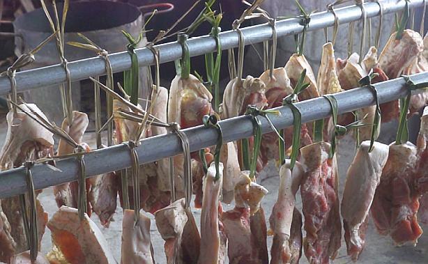 腊肉腌制好了之后就取出来,然后用绳子或者棕榈叶子穿起来,挂在阴凉通风的地方晾干,晾上2~3天之后,肉的表面基本上就干了,这时候就可以放在架子上面开始熏制腊肉了。