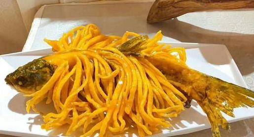 第一道菜:金毛狮子鱼。听名字就知道这道菜肯定是考验刀工的,鱼肉大多数处理的都是整段烹饪或者分大段宰割,但要做出金毛状,细致的切割少不了。鱼肉肉质也比较细嫩,不仅仅只是把鱼肉分条切割,还要保证细度和薄度。这对一个厨师的技艺考验是非常大的,如果一道金毛狮子鱼都能信手拈来,那这厨艺是相当的了得,外国厨师你们驾驭得了吗?