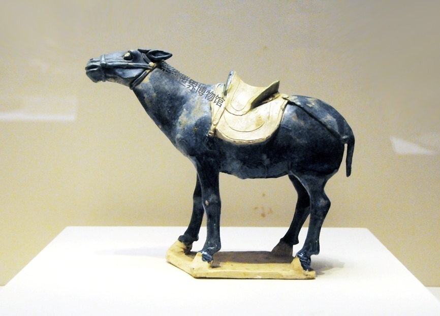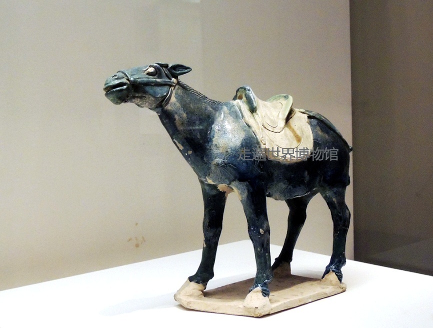 蓝釉陶驴,公元618—907年,唐代;1956年陕西西安出土;中国国家博物馆藏。陶驴全身施蓝釉,伸颈昂首,张口嘶鸣,双耳后伸,鼓腹,尾下垂,蹄露胎,直立于长方踏板上。背部装白色鞍鞘,鞍鞯勒饰俱全。三彩动物俑中多马和骆驼形象,驴较为少见,此陶驴形象逼真,富于生机,造型别致,彩釉明丽,保存完好,故定为一级品(国宝)文物。