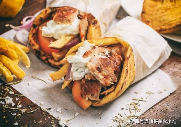 希腊的饮食基本和土耳其爱琴海沿岸相近。Gyros是土耳其旋转烤肉卷饼的希腊变种,和它的土耳其祖宗相比,希腊烤肉卷饼的关键区别在于——它一般是猪肉或鸡肉馅的。