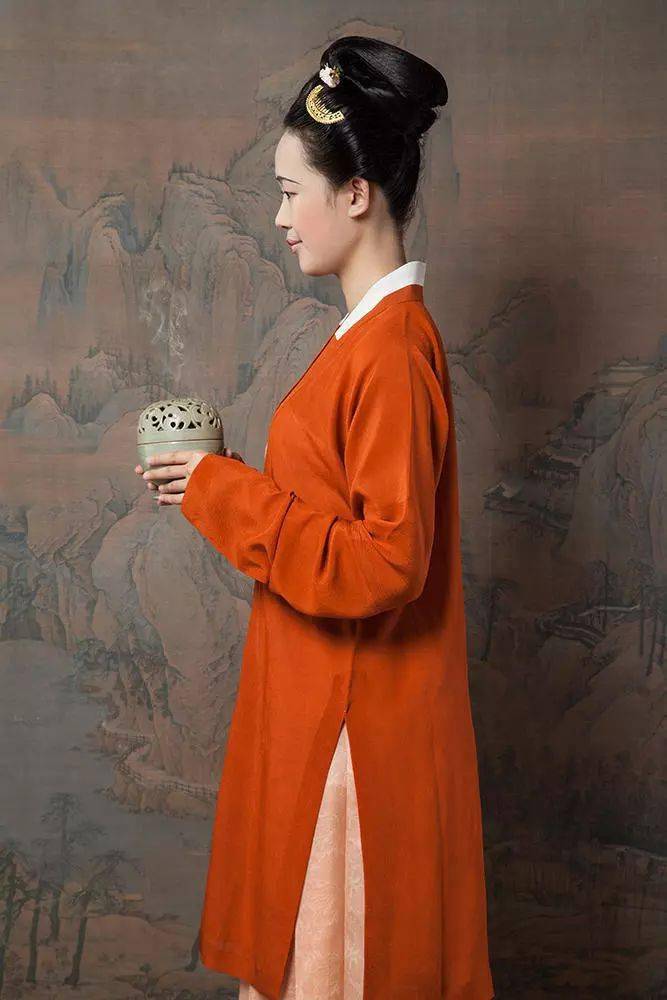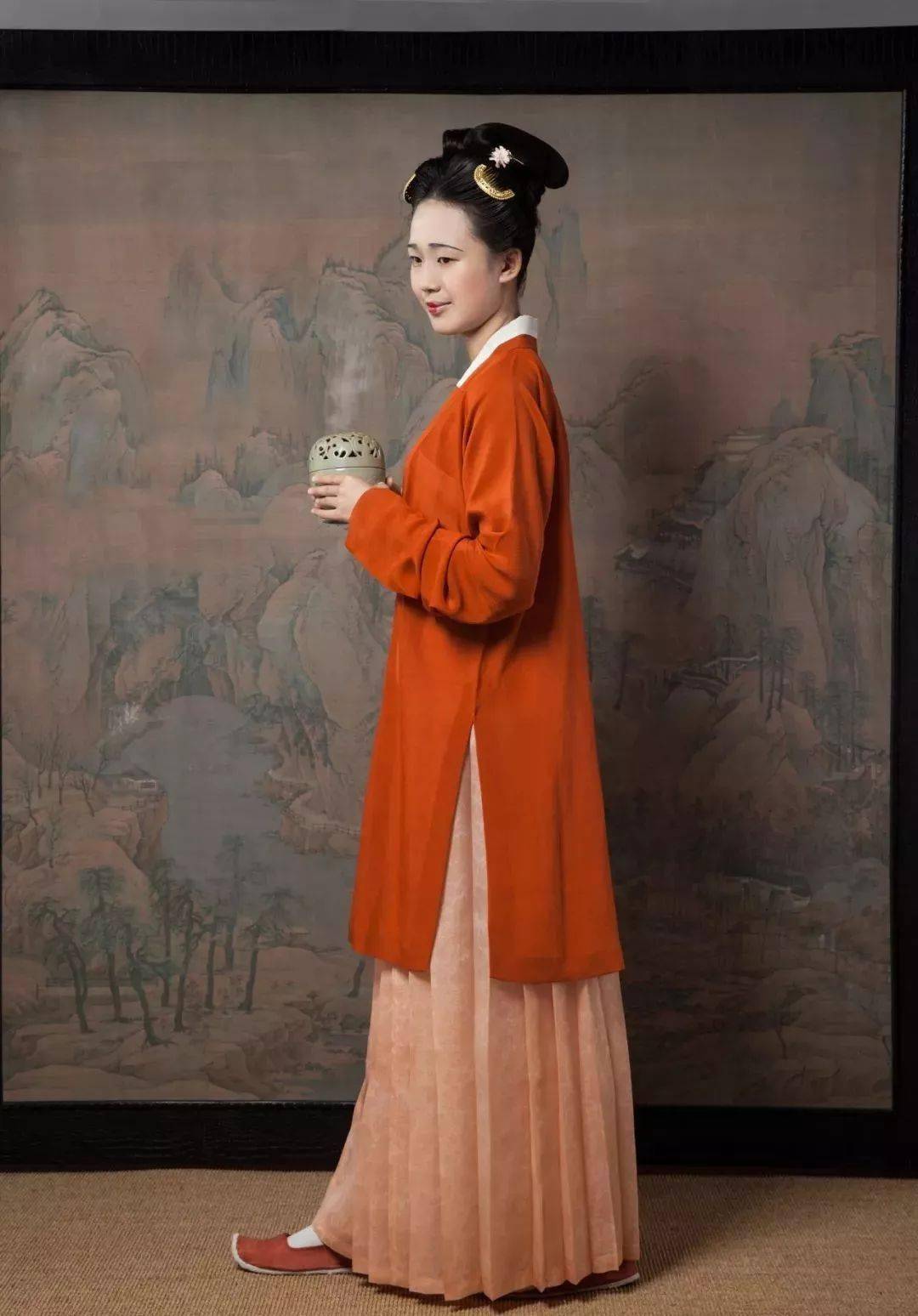 贵族妇女的发髻和花冠,都以大为时髦,发上插的白角梳子有大到一尺二寸的。贵族妇女的便服时兴瘦长,一种罩在裙子外面类似现代小袖对襟褂子式的大衣甚流行。衣着的配色,打破了唐代以红紫、蓝绿为主色的习惯,采用了各种间色,粉紫、黝紫、葱白、银灰、沉香色等等,配合使用,色调显得十分鲜明;衣着的花纹,也由比较呆板的唐式图案改成了写生的折枝花样。男子官服仍是大袖宽袍,纱帽的两翅平直向两旁分开,这时已成定型。便服还是小袖圆领如唐式,但脚下多改穿丝鞋。退休在野的官僚,多穿“直裰”式衫子,戴方整高巾(又名“东坡巾”或“高士巾”,明代还流行)。