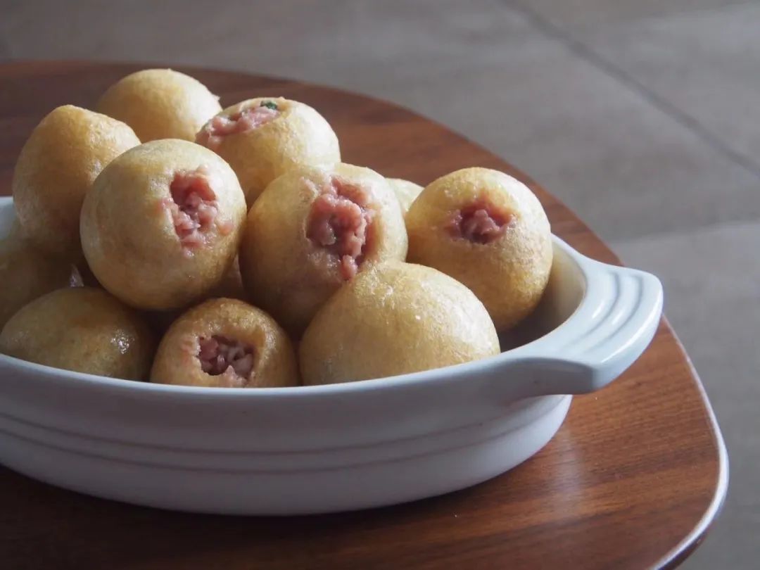 正宗的无锡清水油面筋,外皮薄而松脆,掰开是细密的蜂窝状气孔,生吃时慢慢团进口中,油香清爽,越嚼越韧。买回家基本都是一大袋一买,馋起来做一顿油面筋塞肉(肉酿面筋)——在面筋球上戳一个小洞,把调好的肉馅填满内部,酱油、糖、盐烧上一锅,咬下去扎实劲道,肉香十足,油面筋吸饱了酱汁,又软又韧。