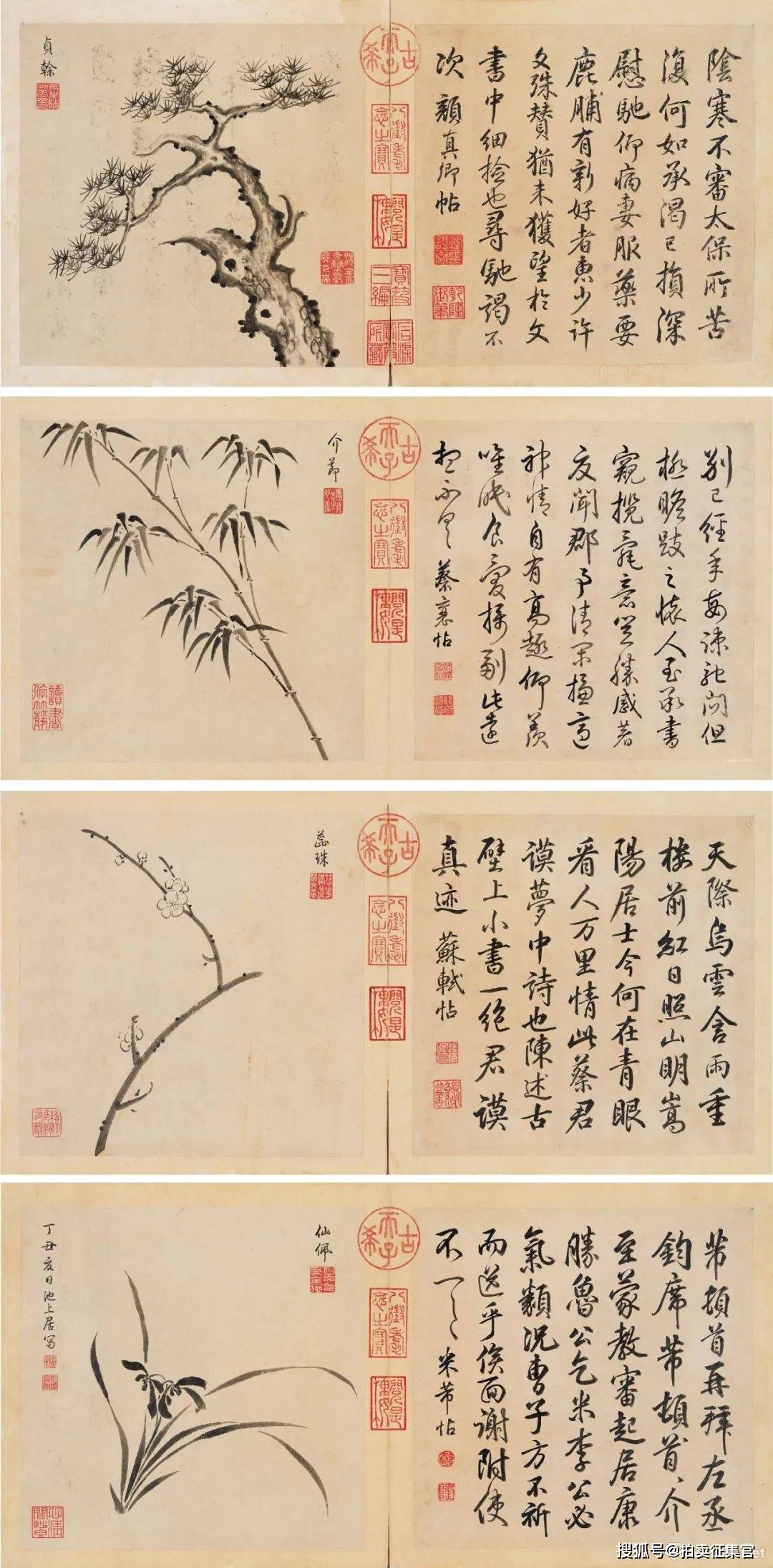 2021年12月4日,北京保利2021年秋拍“仰之弥高-中国古代书画”夜场举槌开拍,呈现宋元名迹、清帝御书、吴门风雅、名家旧藏及金石等专题,共计80余件重磅拍品。其中乾隆皇帝兴之所至所画 《书画合璧册》,表现的是具有象征意义的松竹梅兰四种植物,最终是以1150万元顺利成交。
