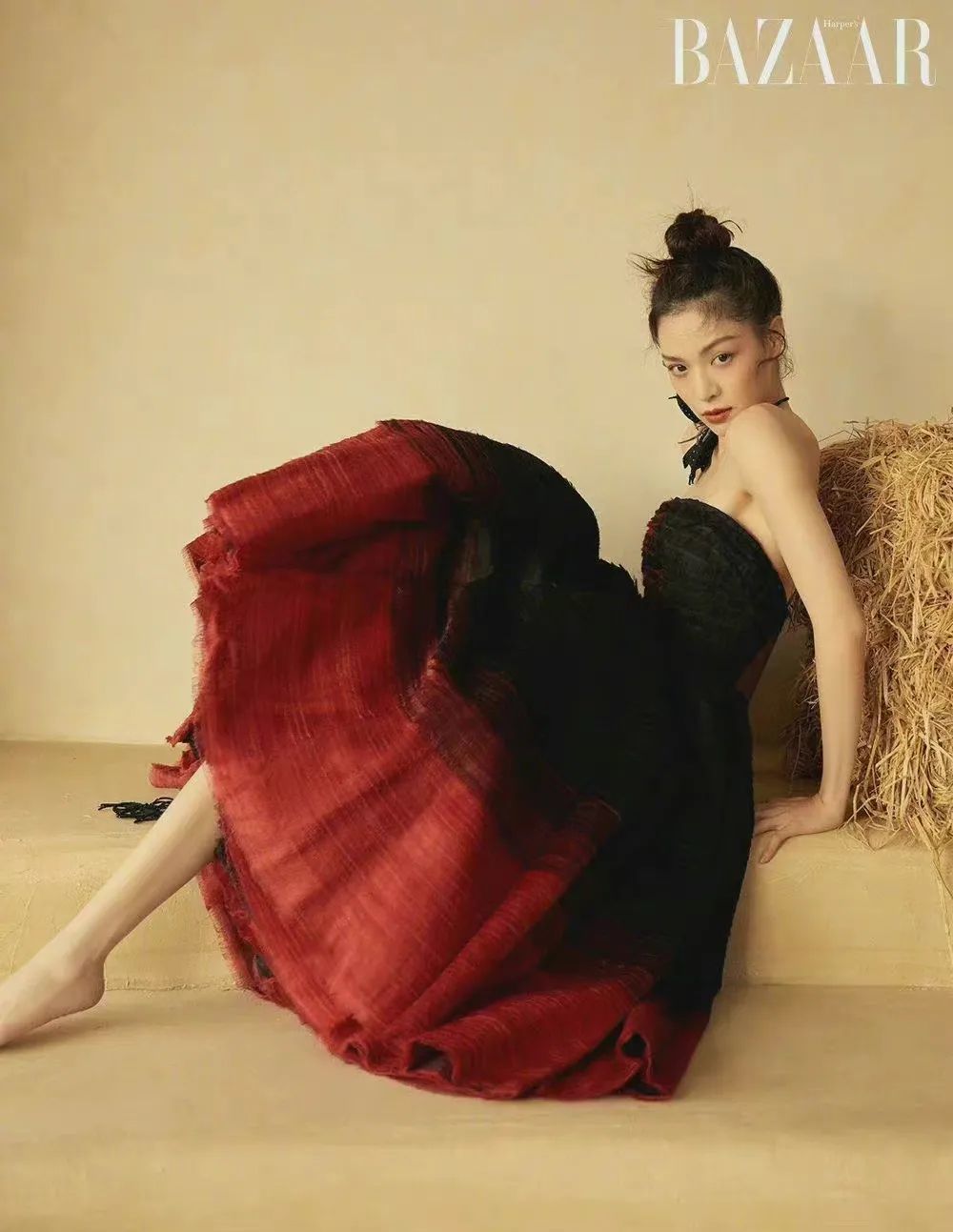 钟楚曦在拍摄越南版《时尚芭莎》2022开年刊时穿着的黑红渐变蓬蓬裙完美衬托出了她大气与优雅的气质。