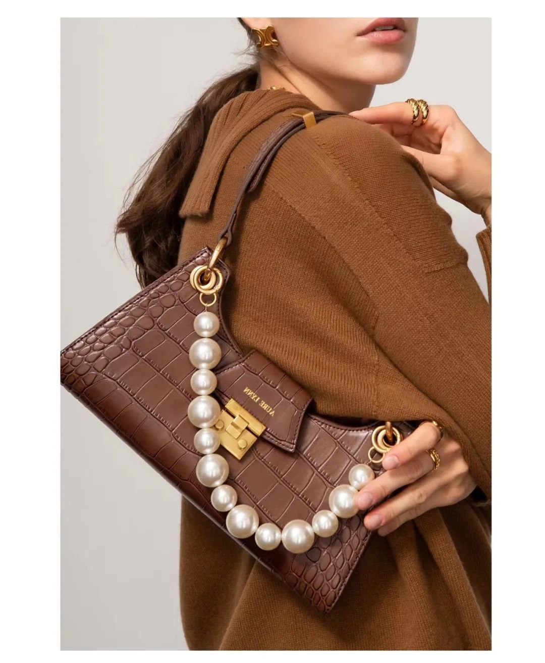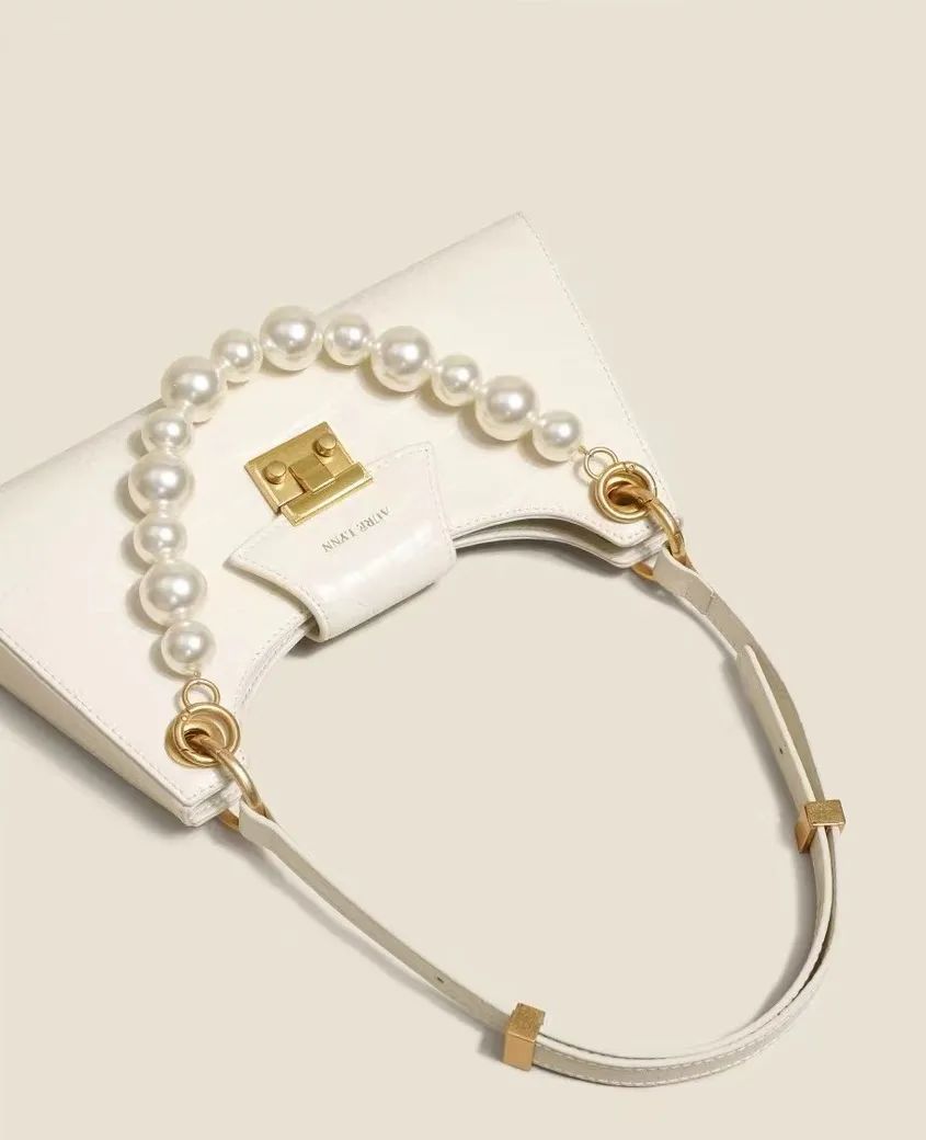 这款带点珍珠元素的白色腋下包自带复古和精致的氛围。除了白色配蓝色,棕色配蓝色也很有秋冬的味道。