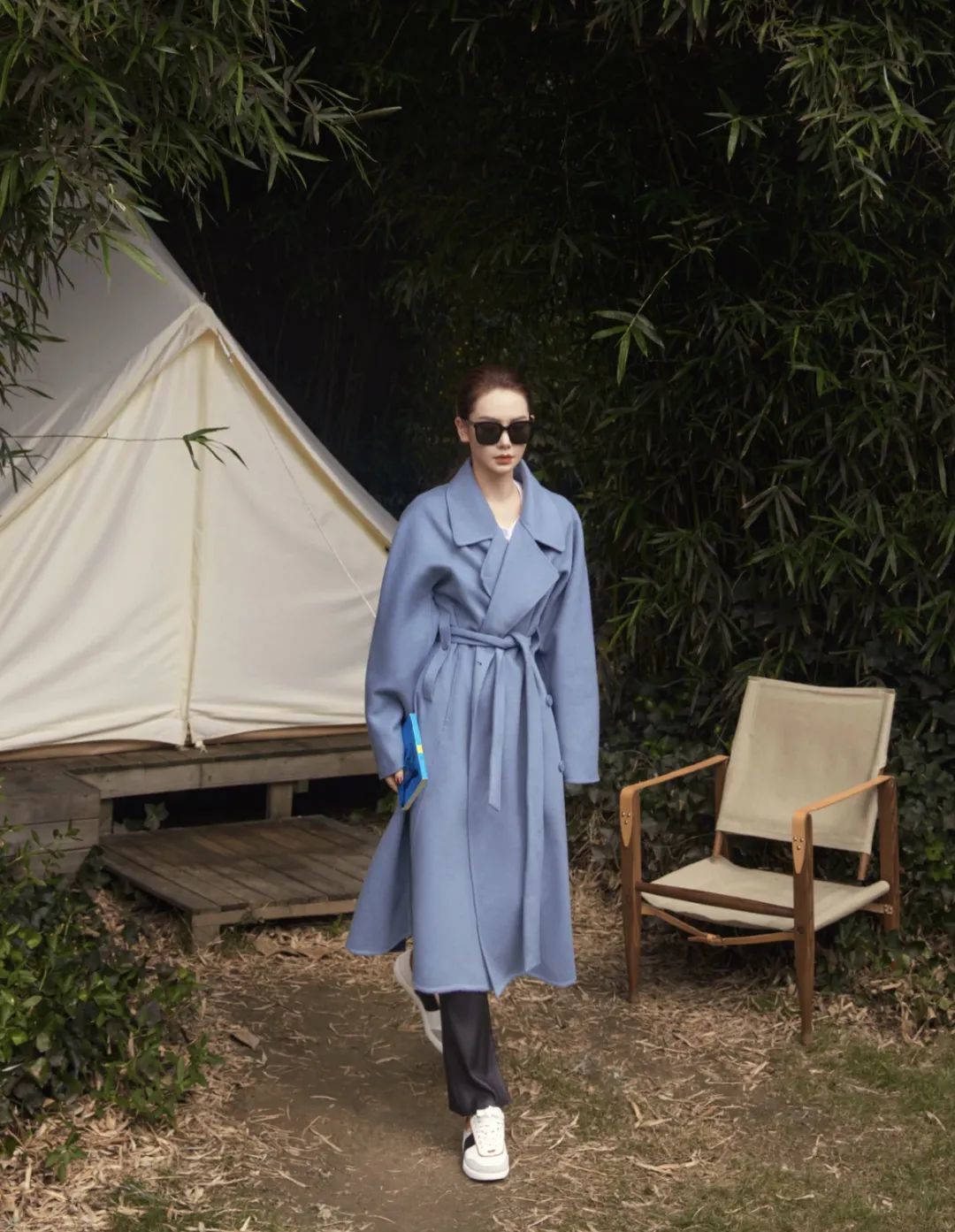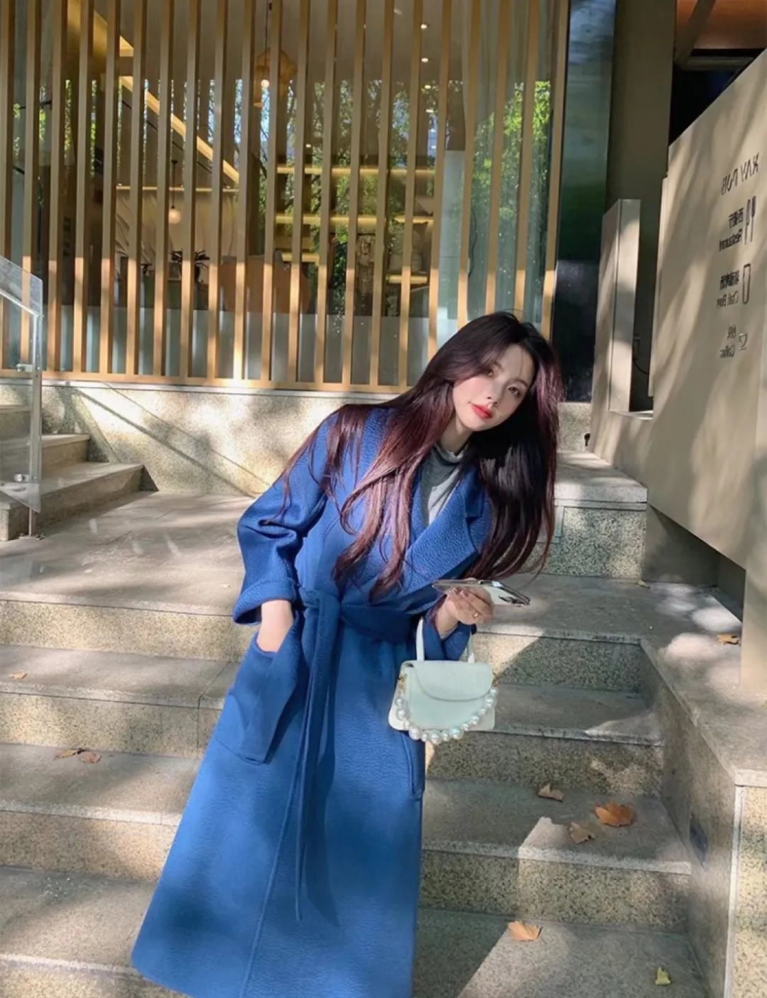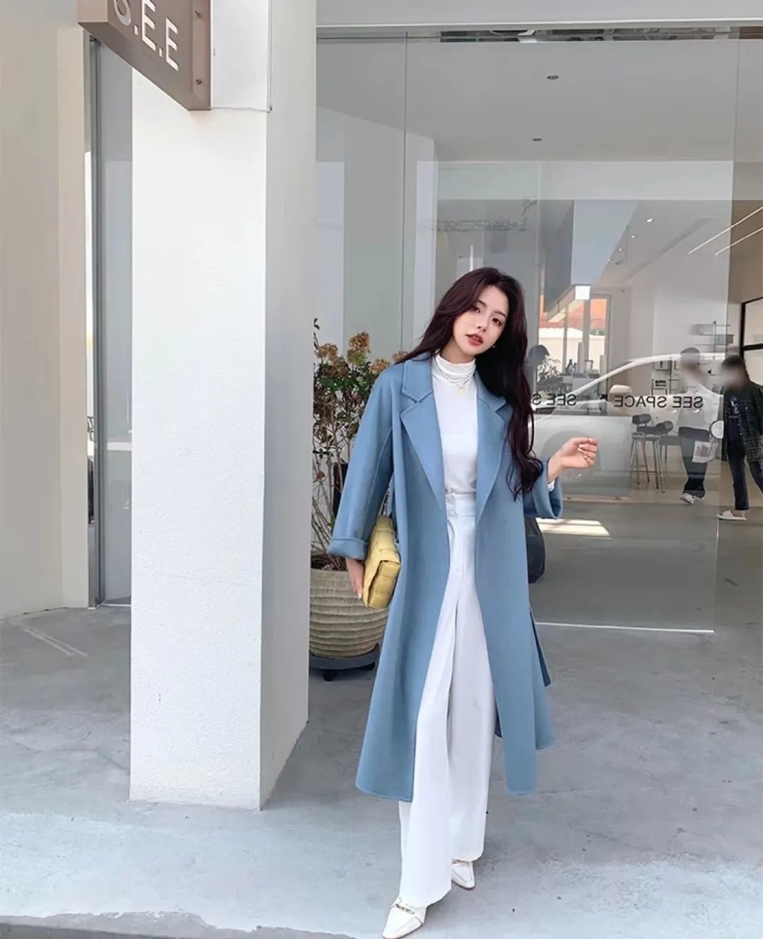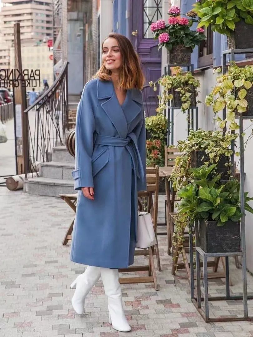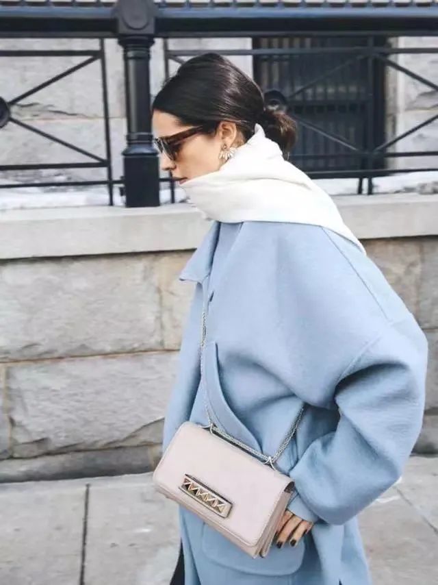 冬季的经典大衣除了驼色、黑色,蓝色也是不错的选择。浅蓝色大衣配白色内搭会给人一种淡淡的高级感,撩人于无形。