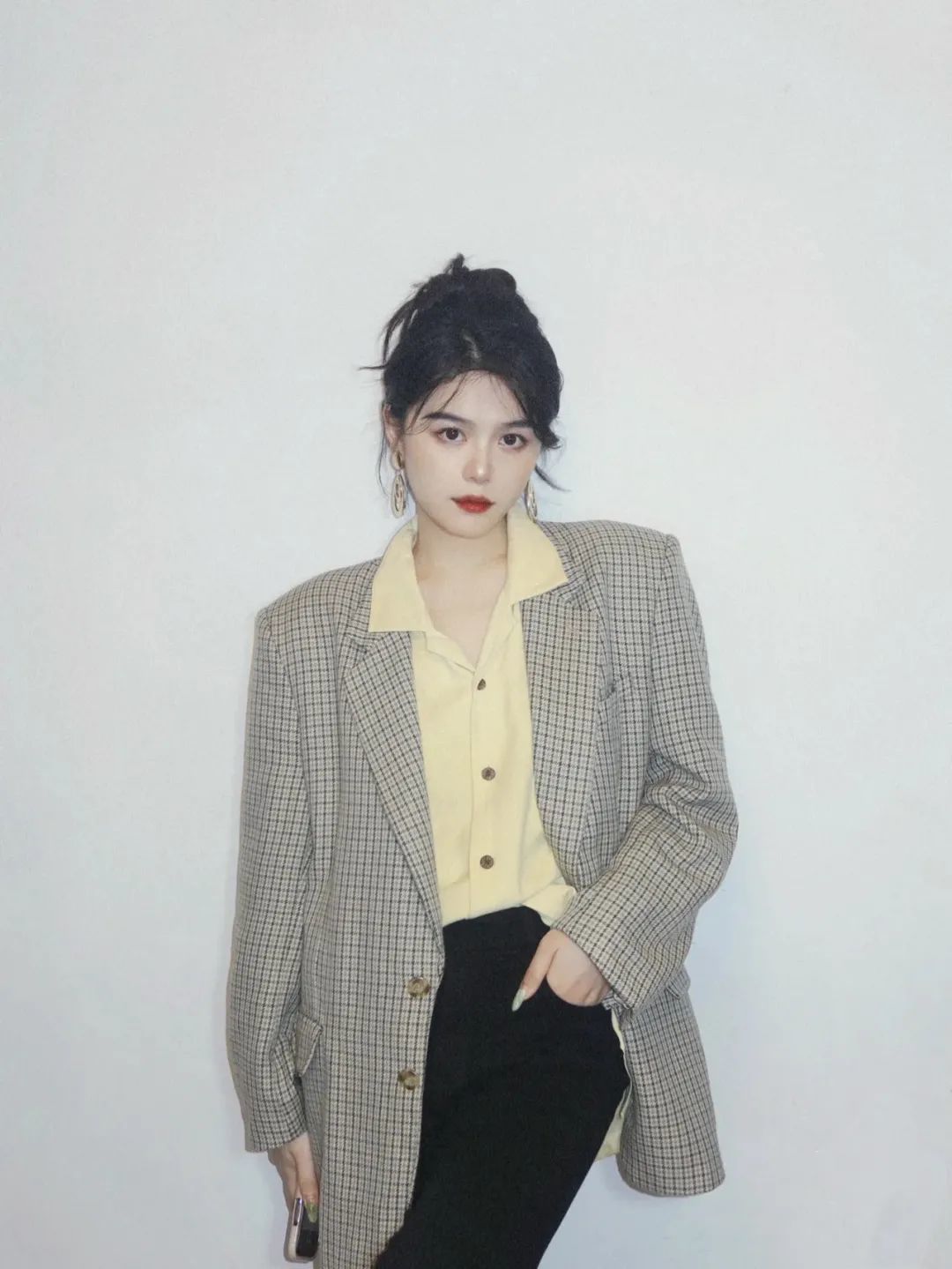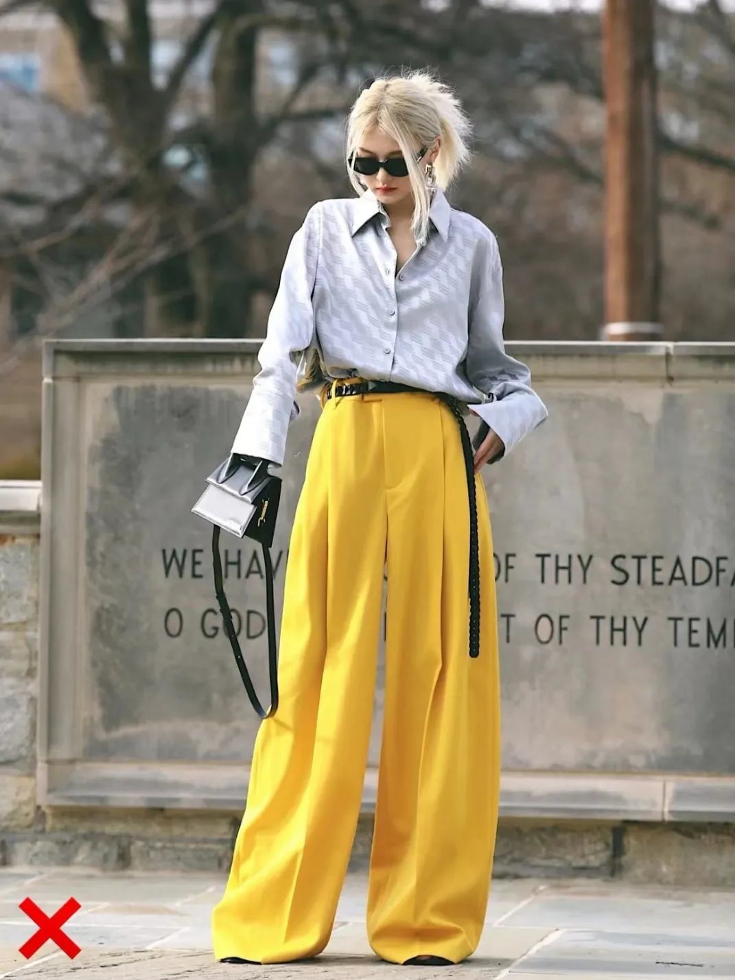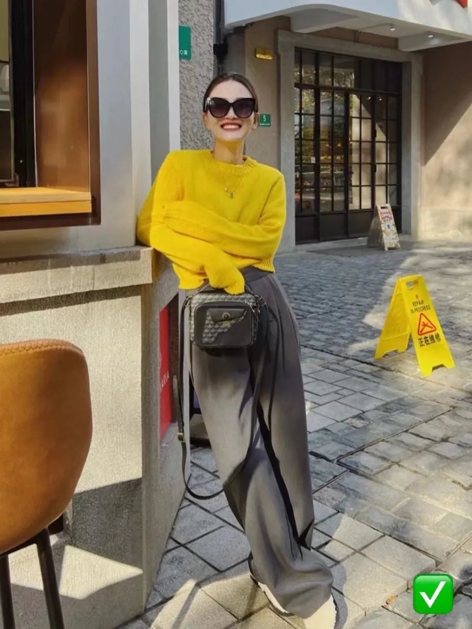 在搭配这两种颜色的时候,大面积穿着亮黄色过于跳脱,不适合日常穿搭。她姐建议亮黄色作为小面积点缀。包包、鞋子、帽子等配饰都是不错的选择。
