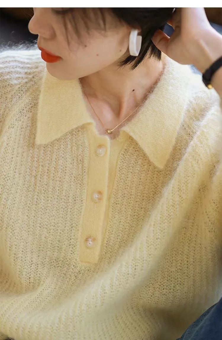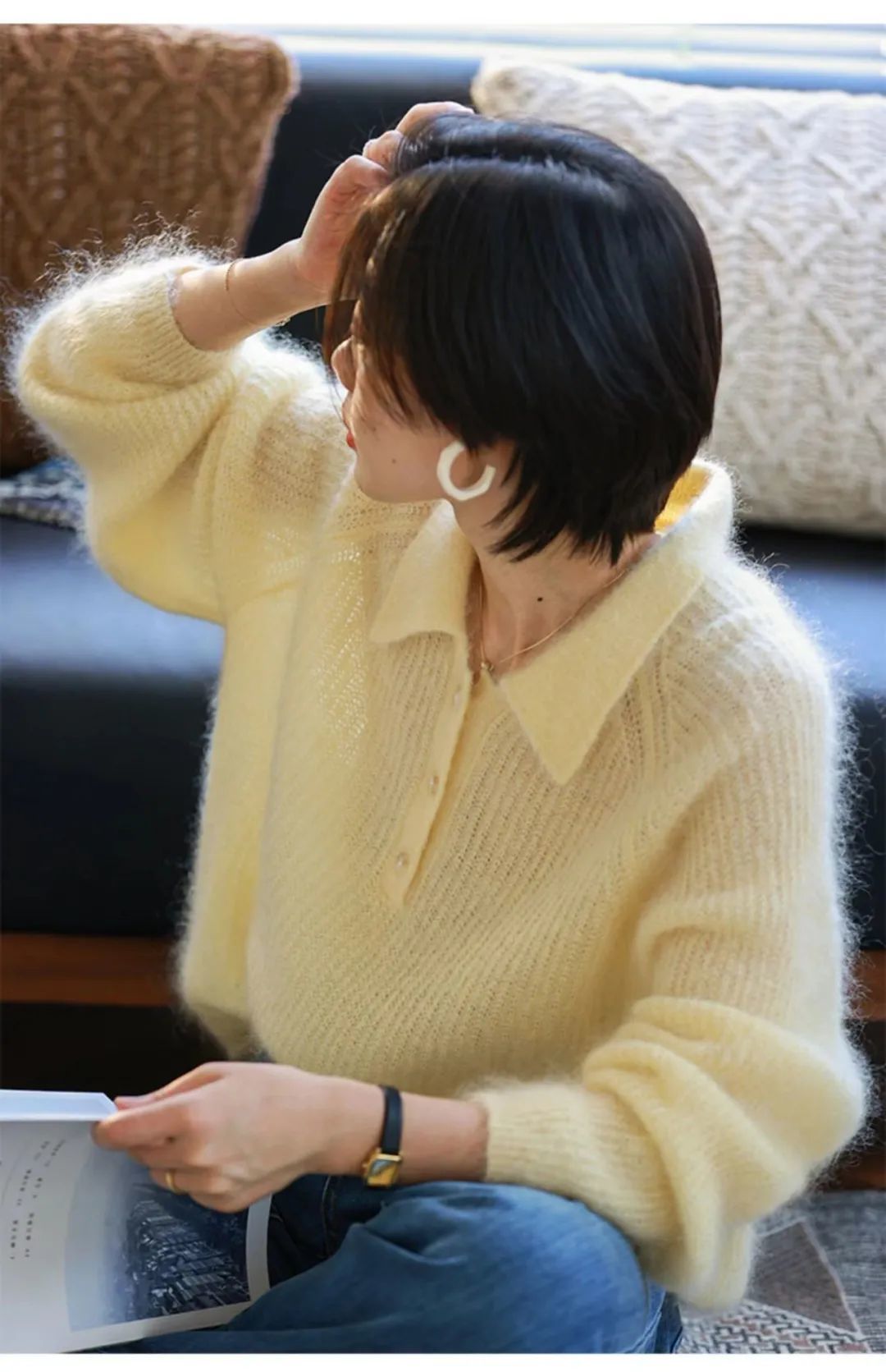 这件奶黄色毛衣是她姐近期的心头爱。POLO领的设计很衬托脸型。扣子可以系上或是解开,能呈现出不一样的风格。