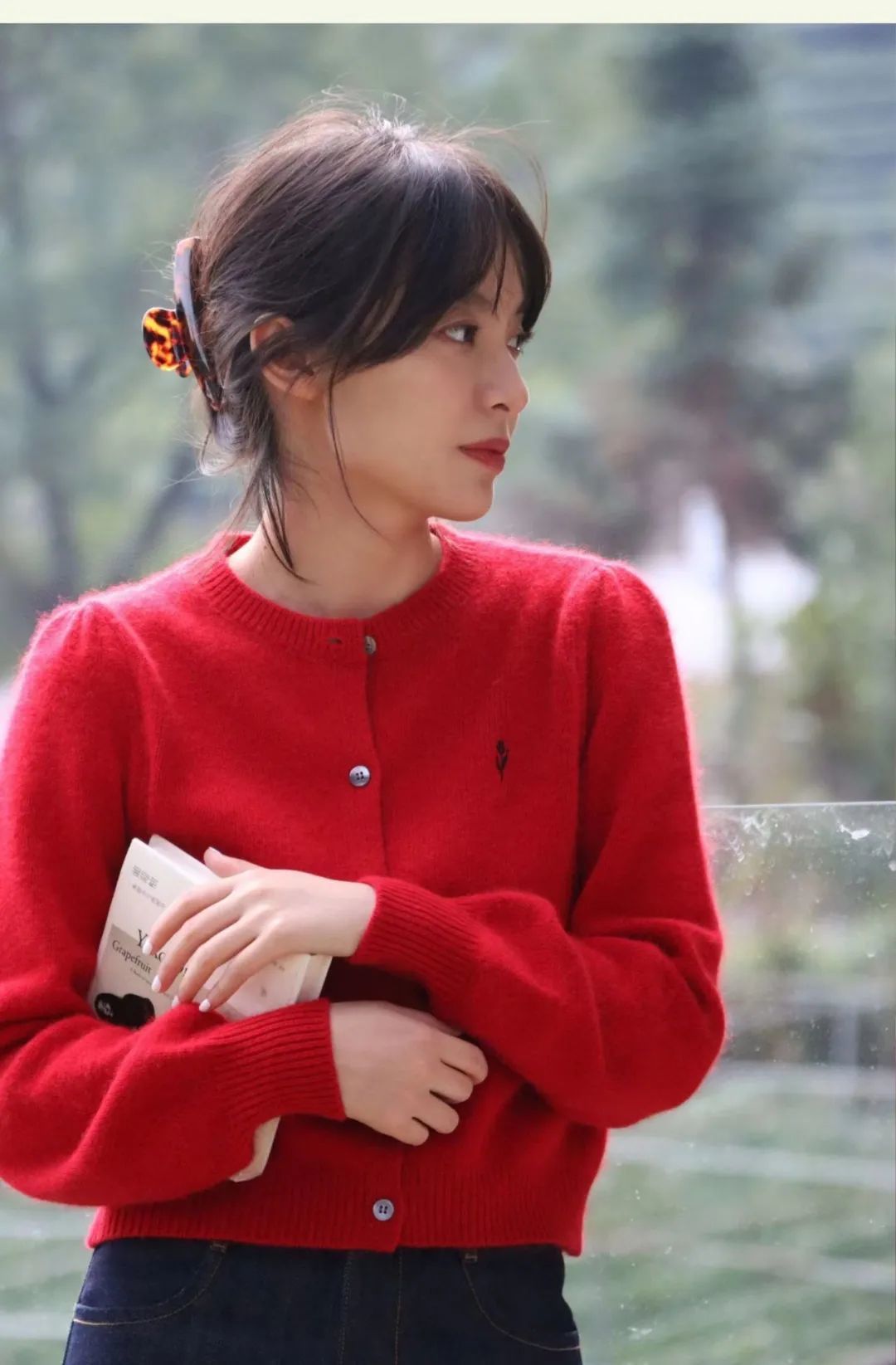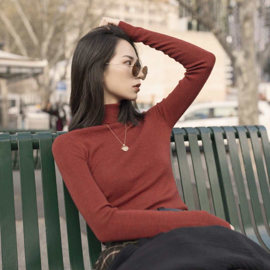 红色也非常适合作为秋冬内搭的颜色选择,穿在黑色或是深灰色毛衣、开衫里面,既能点缀,又能显白,还增加了整体穿搭质感