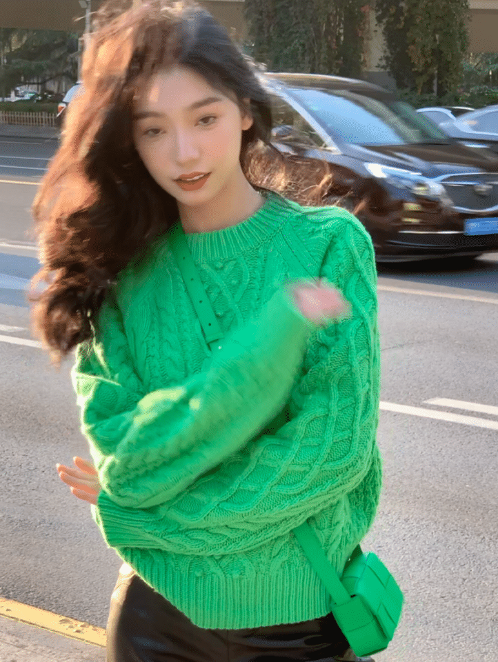 氛围感美女易梦玲也深谙色彩驾驭之道,绿色毛衣配同色系小包包,俏皮又吸睛。