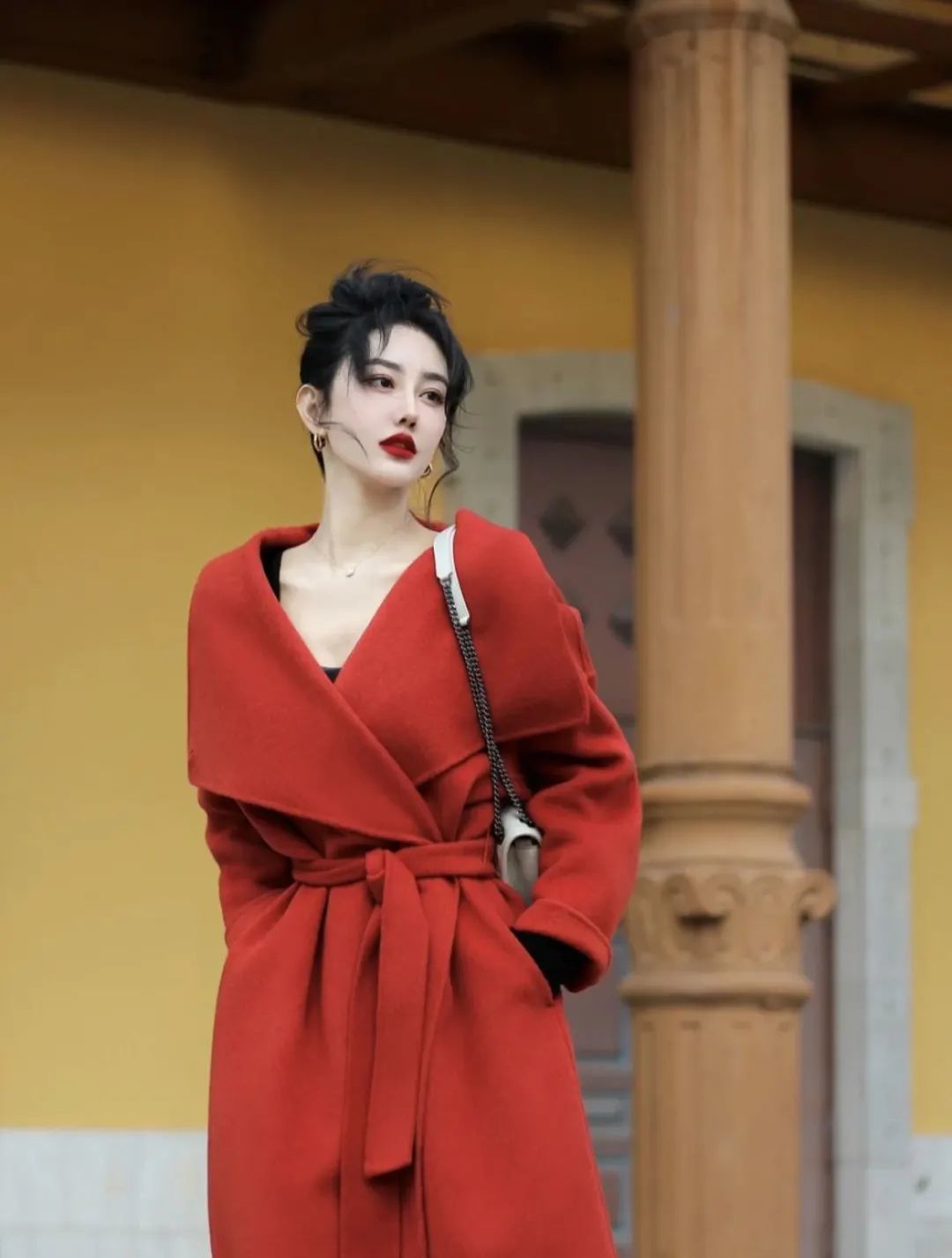 也可以试试红色大衣配黑色内搭,大面积使用红色的搭配方式,复古优雅的同时气场全开。但在挑红色大衣时,一定要选颜色正、版型简洁大气的,否则就会穿出土气。