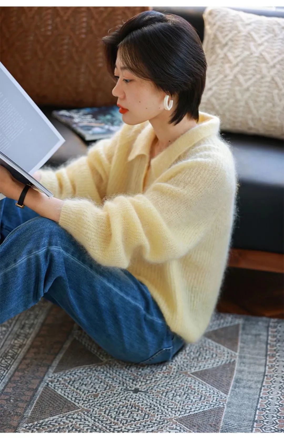 毛衣质地是软软柔柔的马海毛,穿上一点也不扎。下半身配个裙子或是裤子都能轻松驾驭,可盐可甜。