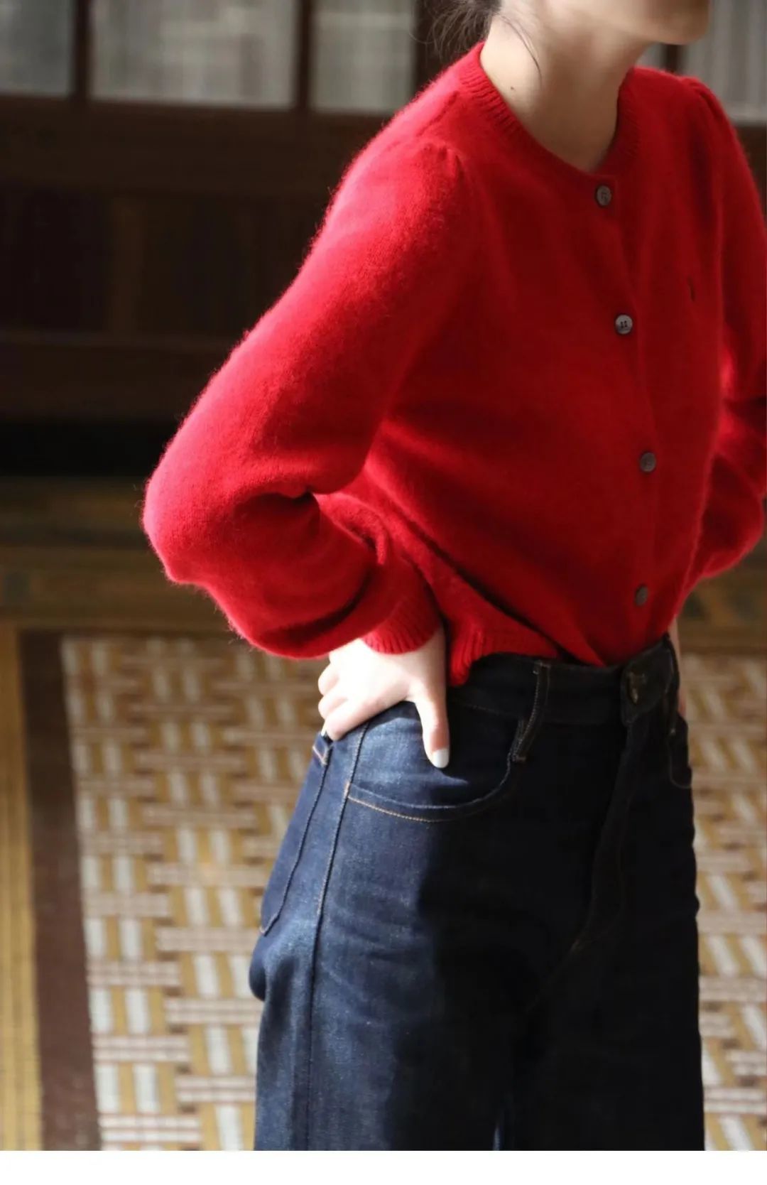 这件她姐非常心水的正红色毛衣是由比山羊绒更柔软、更保暖的浣熊绒材质制成,穿上去完全是千金大小姐的贵气感,显得人很有气色。