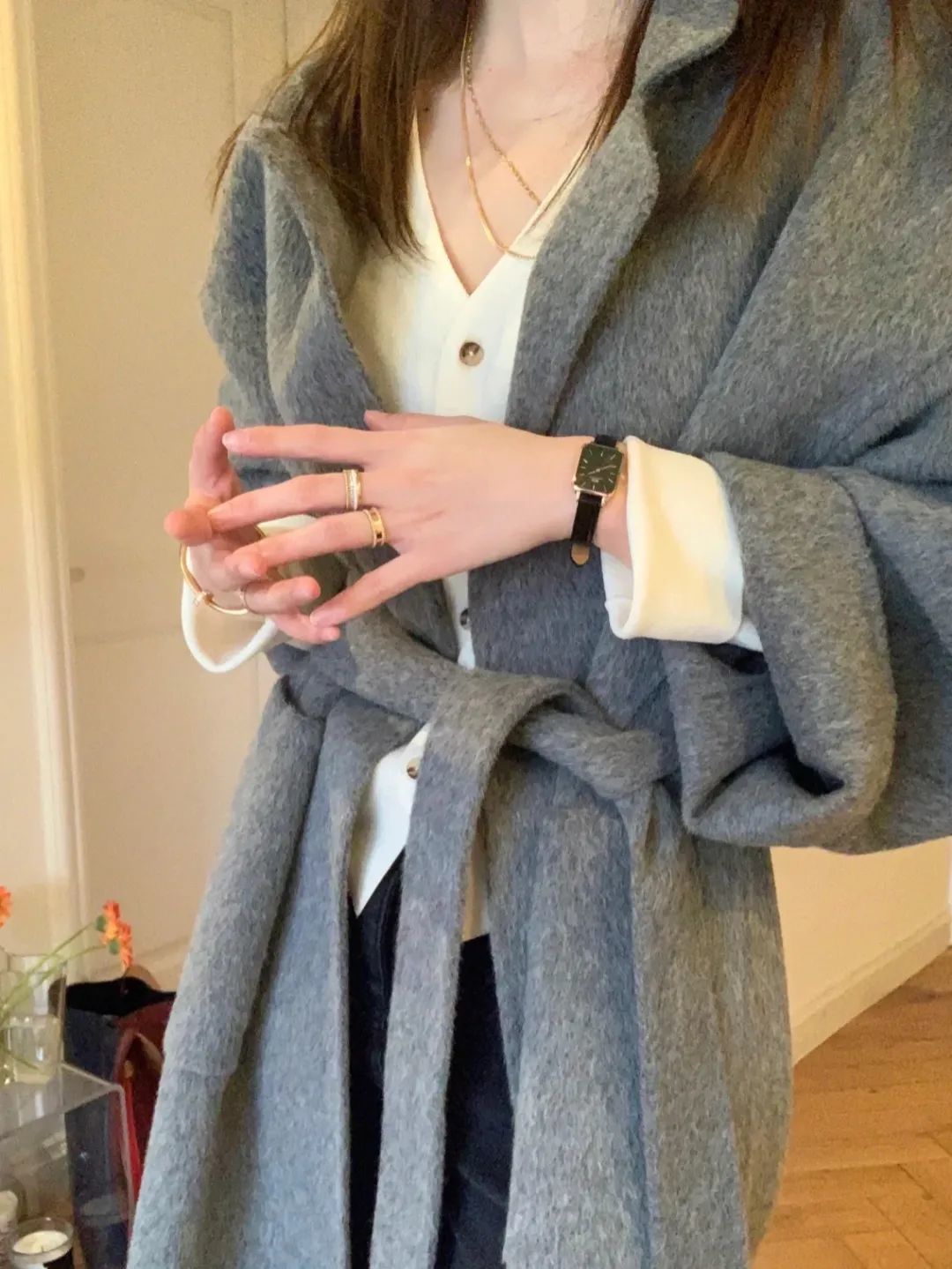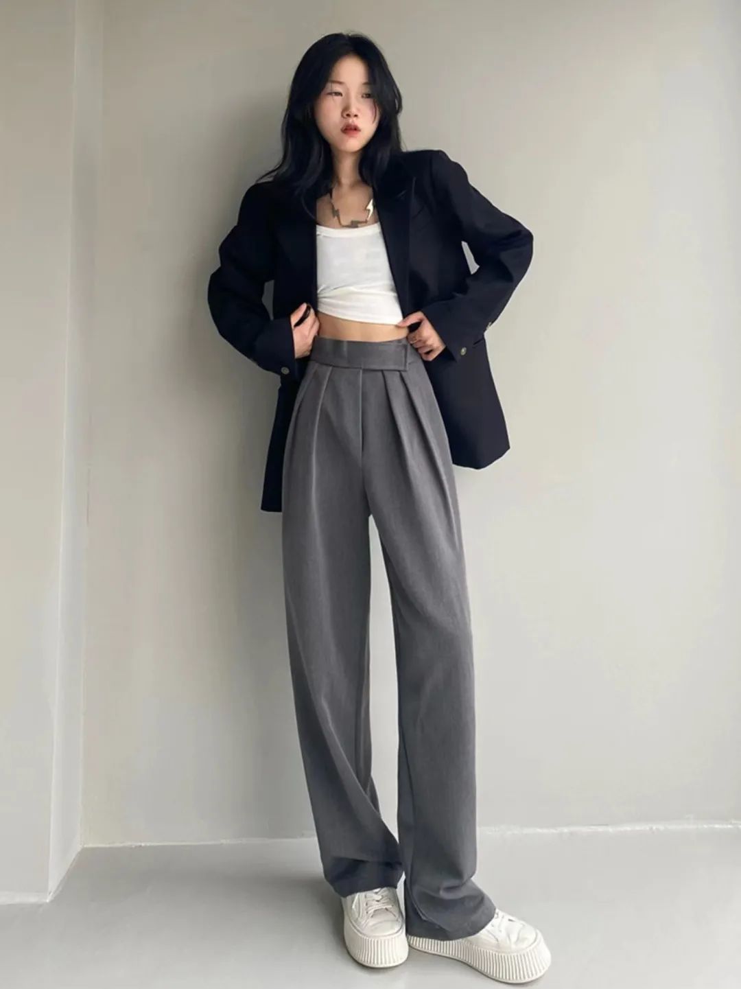 如果让她姐一条裤子过冬天的话,那这件灰色西装裤绝对是首选。无论是版型还是材质都很优秀,腰间的魔术贴设计让穿脱更方便。