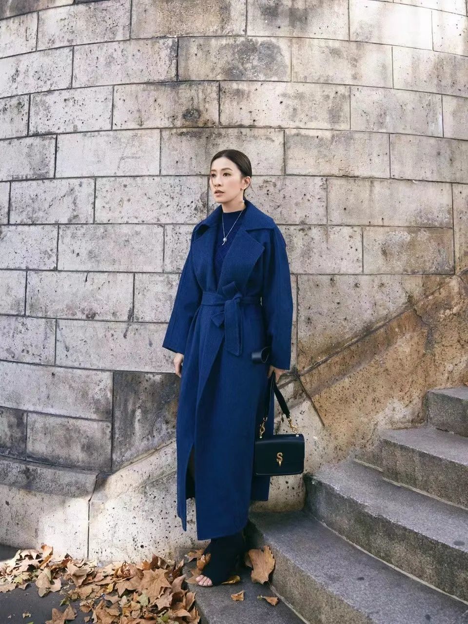 而深蓝色大衣会给人一种力量感,更适合本身气场比较强的女性。如果不想整体颜色过于厚重老气,可以穿白色、米色内搭进行中和。