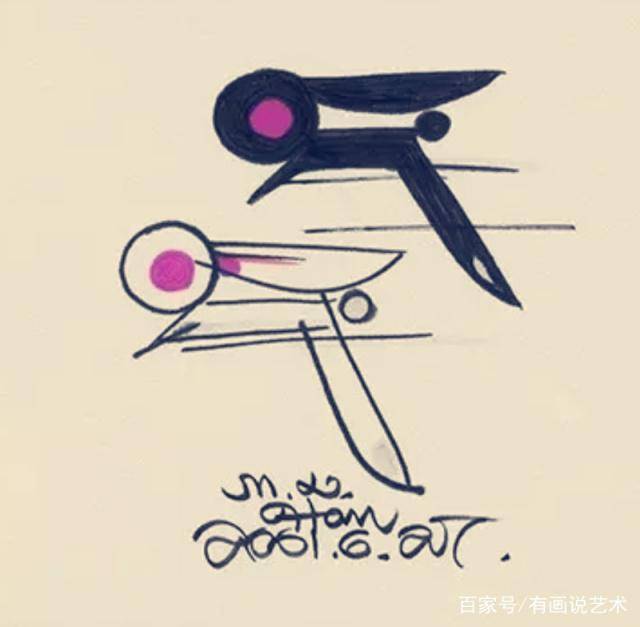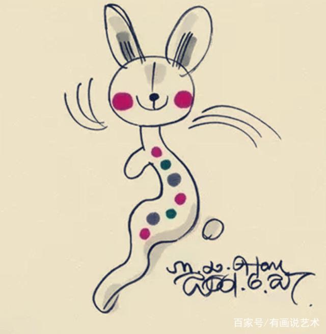 如果你想向韩美林学习成功经验,那有些事你可能根本学不来。譬如说他在六十五岁时还能追求到小自己二十八岁的大美女周建萍,一般土豪可能就是用金钱攻势砸晕对方,但韩美林不是,他充分利用了自己的特长和优势——绘画,他专门画了179幅画儿向周建萍表白,其中就有图二和图三这两幅可爱的小兔子。图二中的小兔子有两只,似乎寓意着两人的爱情朝着幸福狂奔,而图三中的小兔子可能是用来形容意中人的可爱,总之周建萍看到这些画既感动又开心,超级喜欢,韩美林也因此赢得了美人芳心。
