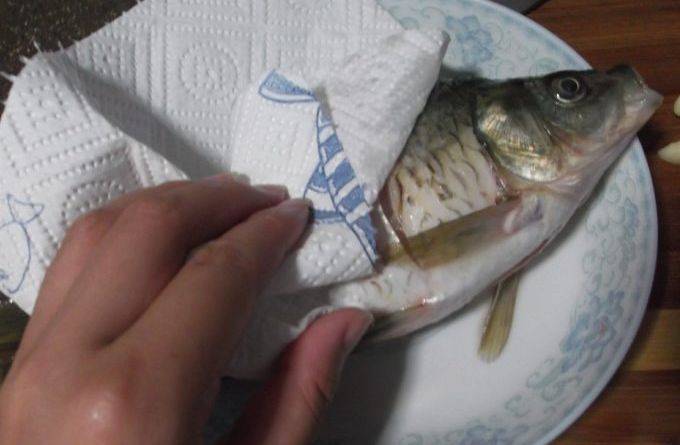 随后取多张厨房吸油纸,把鲫鱼上的水份擦下去,存水得话煎鱼会黏锅也会油炸锅,而鲫鱼维持干躁,煎鱼越来越轻轻松松许多。