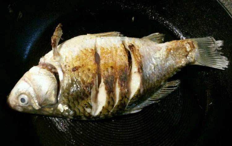煎好后给锅内加温水配少量姜片,调至走红炖鲫鱼,半途不必调火,一直走红。