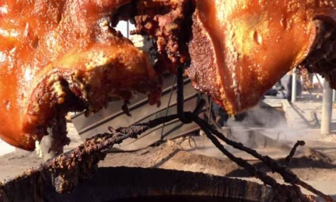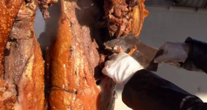 拉回家以后,把这每一头都两三百斤的猪,沿着需要的地方用刀砍开,用刀子把猪肉一条条划开,进行腌制,腌制一小时之后,用起重机将猪放进自制4米深的土炉子里,先将土炉子里的柴火点着之后,再把猪放进去,用泥土将整个炉子封好,一个小时之后,这烤全猪就出锅了。