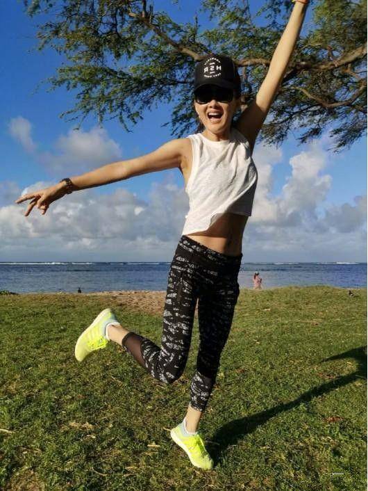 牛莉扎着高高的马尾辫,头戴鸭舌帽,身穿白色背心,下身穿着彩色条纹紧身衣,脚上穿着一双黄色运动鞋。她看起来像十几岁的少女,不会让你看起来很无聊,还会让你加倍阳光。