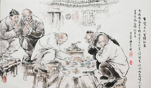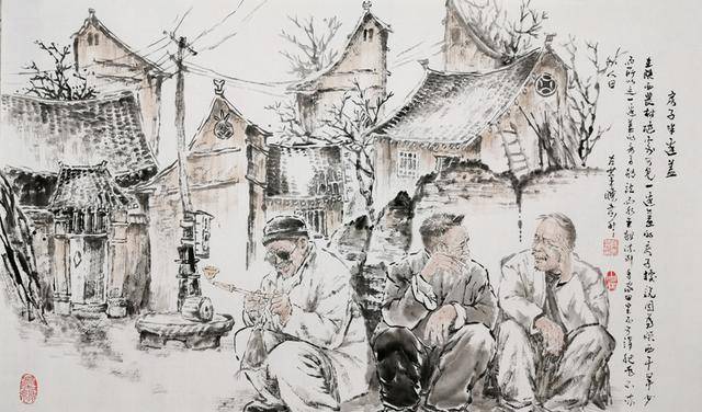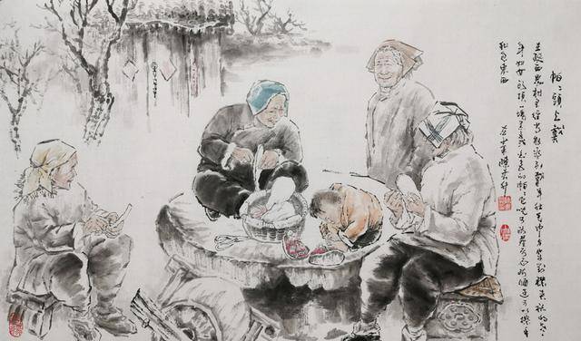上图这幅《手巾头上戴》也是关中八怪之一,画面描绘了四位老太太一边做针线活一边弄孙为乐的场景。画家以其朴素的画笔描绘了普通老百姓生活的这一细节,画中的人物头戴方巾,悠闲地坐在碾盘上,抑或驻足矗立抑或席地而坐,无不其乐融融。画面构图雅致,墨色浓淡相宜,小写意的画法与这一场景融为一体,真正体现了“诗中有画,画中有诗”的优美意境。