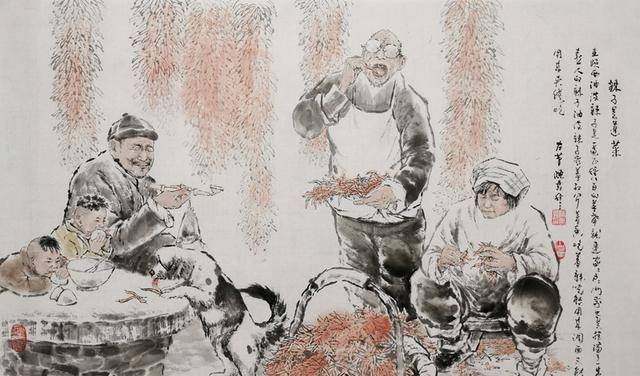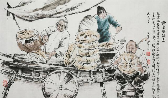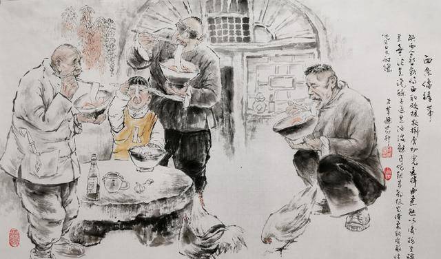 上图这幅画反映的是关中老百姓吃面条的情景。画面中无论大人还是小孩都捧着一个粗瓷大碗,大口地吃着当地特有的“大宽面条”,当地人称之为“面条像裤带”。从这幅画的构图和布局便可看出画家深厚的艺术功底,画面中的人物不仅栩栩如生,而且充满了生活的真实意味,令这一鲜活的形象犹如浮现在我们眼前一般。