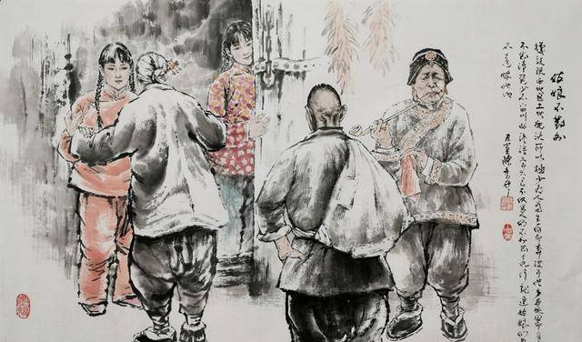 从前,关中地区有这样一种说法,“金窝银窝不如自己的鸟窝”,所以很多人不愿意将闺女远嫁他乡,但随着社会不断发展,这一习俗也已渐渐成了过去。画家用手中的画笔帮我们留住了记忆中这道有趣的画面:上图这幅画反映的便是陕西八大怪中“姑娘不对外”的风俗。画家通过细腻的画笔,将人物的动作神态描绘得惟妙惟肖,尤其用眼神的刻画来“说话”,描绘出右侧老太的刻板封建,左侧小姑娘的羞涩腼腆,整个绘画给人一种浓浓的乡土气息,纯朴而又动人。