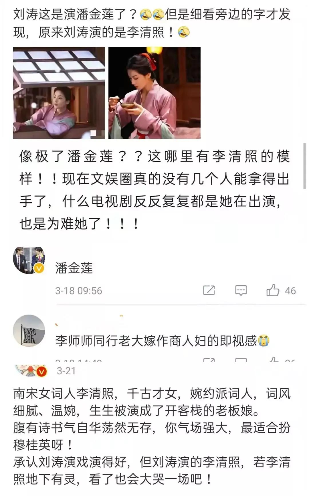 近日,刘涛饰演的李清照角色被喷,网友们惊呼:这是饰演的潘金莲啊!的确在照片中可以看出来很多场景和道具都和潘金莲能搭上关系,和李清照的温文尔雅有点不搭。