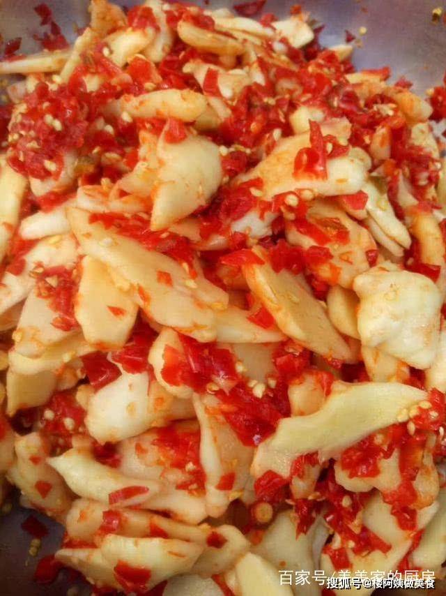 将切碎的辣椒和生姜片一起混合均匀,腌制几天即成剁椒泡姜,香辣开胃,一年四季都不可缺少呢。湖南人家家都备着一个大大的坛子,一次就做够一年的量,每天都吃一点,祛湿又健胃,对身体特别好。