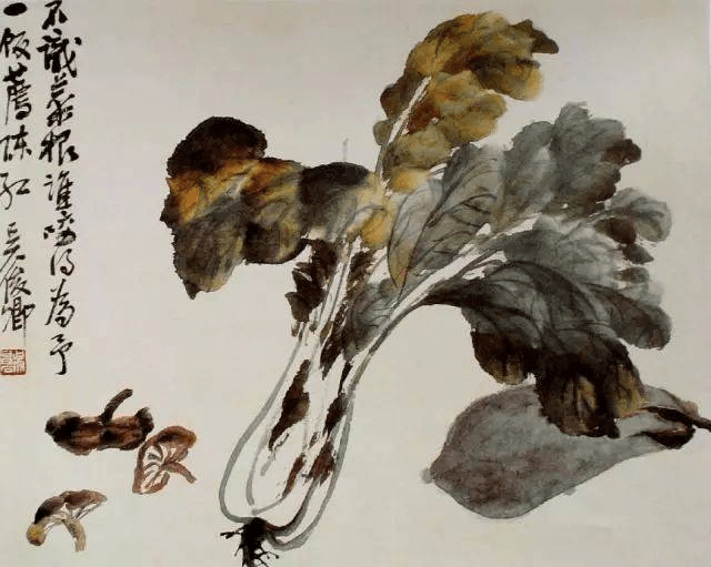 需要注意的是,一般植物质的颜料不宜与矿物质的颜料调和,因为溶水性的差异会形成一些渣粒,使画面变脏。但有时在局部使用也可获得意味的效果,如画叶片的虫咬处时,即可采用此种调色。吴昌硕《花卉图 蔬菜》