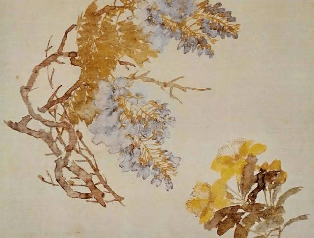 6.点垛法:以笔肚蘸基本色,笔尖蘸另一色,以书法的运笔方式写出物象,一笔点出浓淡干湿。多用于花头和小叶片的点写。清 恽寿平《桃叶柳枝》(局部)