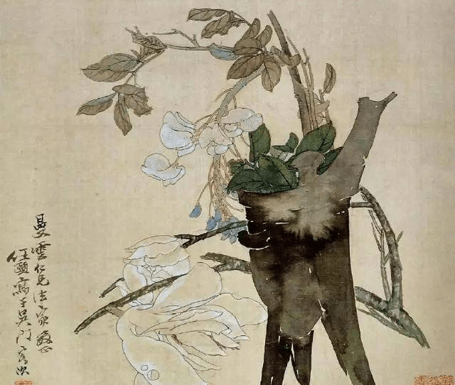 5.破墨法:运用两种不同色度、不同含水量的墨在未干的画面上重叠,或淡破浓,或浓破淡。清 任伯年《清供图》